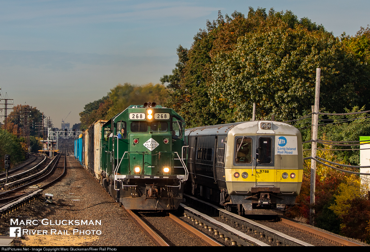 | Meet in Floral Park. As a train of MTA LIRR M3s heads towards New York’s Penn Station, New York and Atlantic Railway’s RS-40 heads east on October 31, 2018. NYA GP38-2 268 leads with a mixed consist of freight for customers. This engine served passengers for many years on the LIRR before being transferred to freight service. |