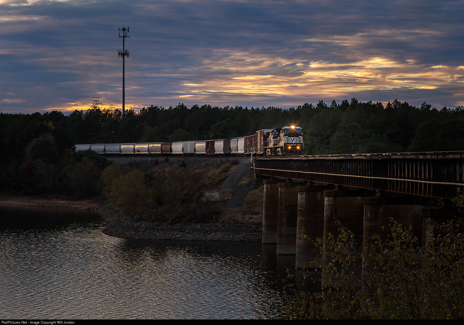 | As the sunset fades to darkness, a northbound mixed freight rolls over Lake Hartwell in Clemson, SC with a duo of thoroughbreds leading. |