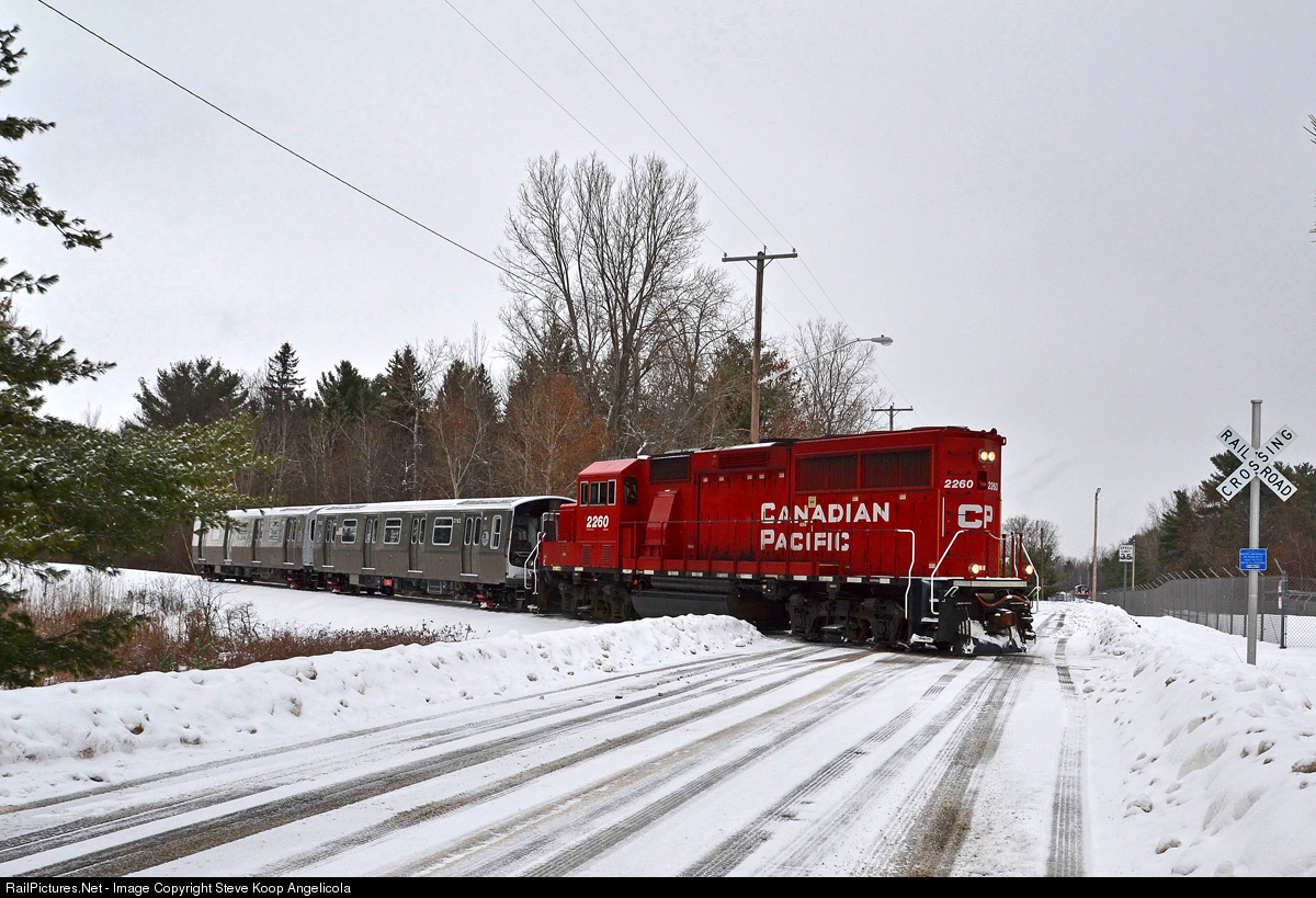 | After a November snow squall the Canadian Pacific Plattsburgh local D11 is moving two brand new Bombardier subway cars from Bombardier's main plant to their test track. This will be the last stop before they are delivered to the New York City MTA subway. |