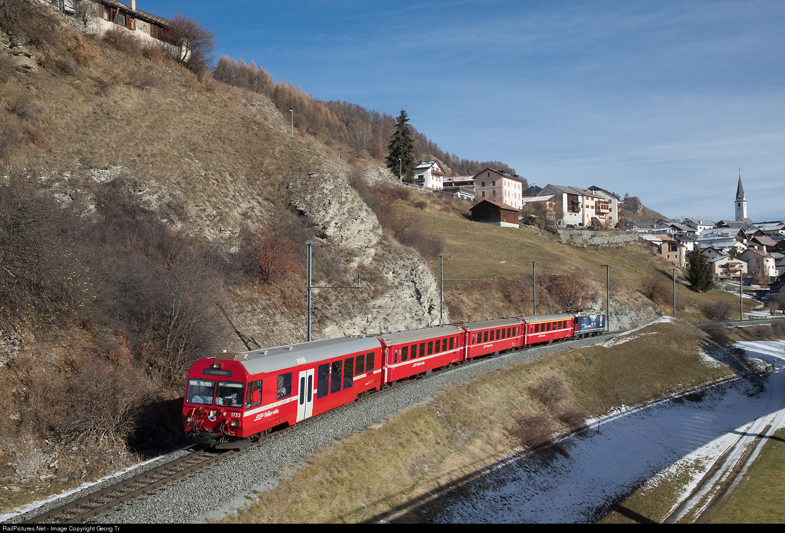 | Push-pull train with leading cab car NEVA BDt # 1752 and shoving Ge 4/4 II # 627 "Reichenau-Tamins" (in publicity paint scheme for 100 years Chur-Arosa 1914 to 2014) in the rear is leaving Ardez as regional train 1933 from Scuol-Tarasp to Pontresina. |