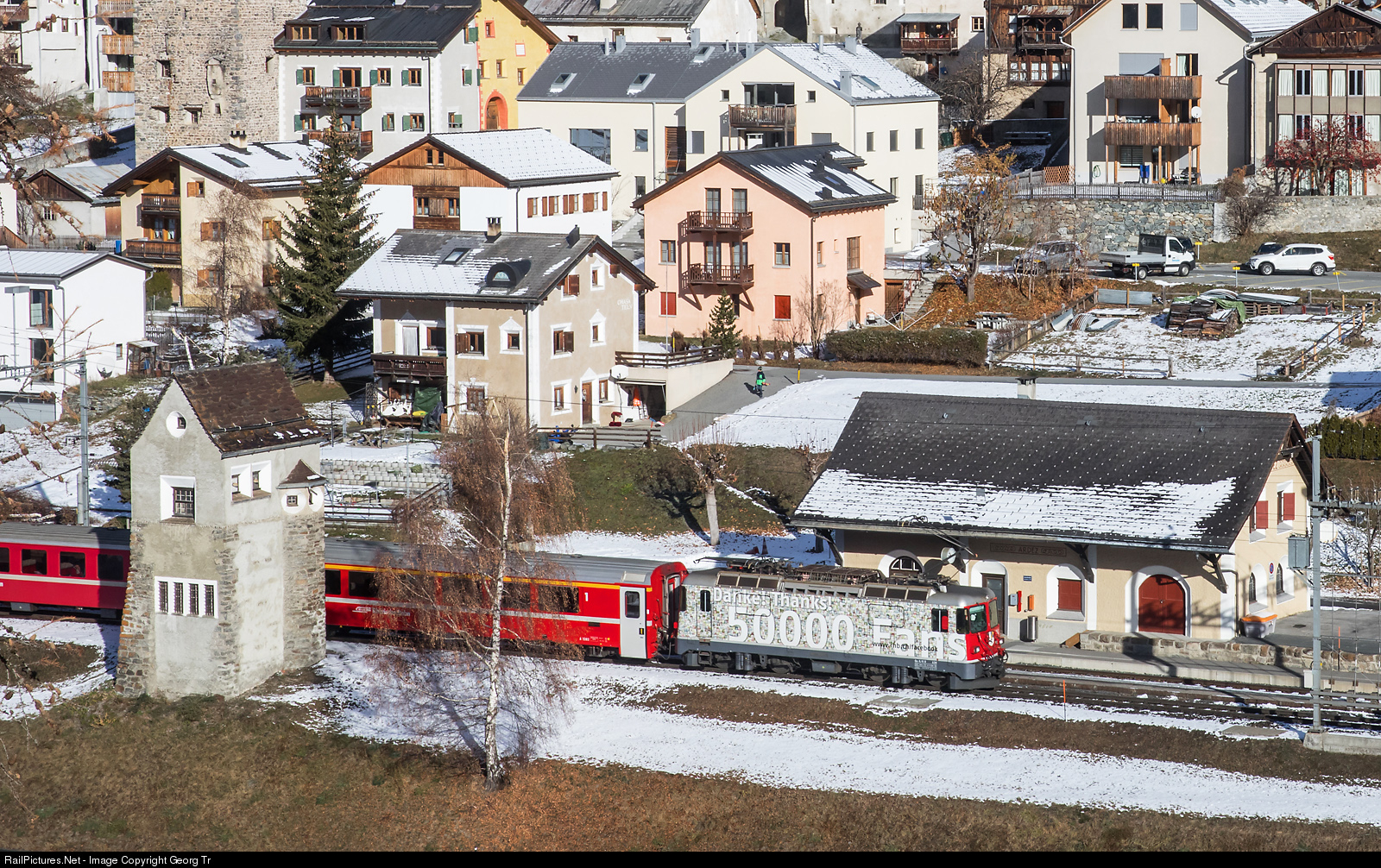 Ge 4/4 II # 624 "Celerina/Schlarigna" has a special paint scheme (foils) since 2014 already, saying the Rhaetian Railway has 50000 fans on Facebook. The background of the design is made of 50000 small portraits of the persons, who sent their picture to the RhB. The locomotive is leaving Ardez, shoving the push-pull train Regio 1929 from Scuol-Tarasp to Pontresina. The car is a standard IV type first class long version, from which only 3 were built (two operational nowadays) in 1993. Still one of the most comfortable cars of the RhB! The castle-like nice building on the left is a typical former power switching station house (not used anymore), common at the stations in the Engadine, which was electrified with 11000 V 16,7 Hz AC from the opening in 1913. The station building in the Engadine style is typical for the line, too.
