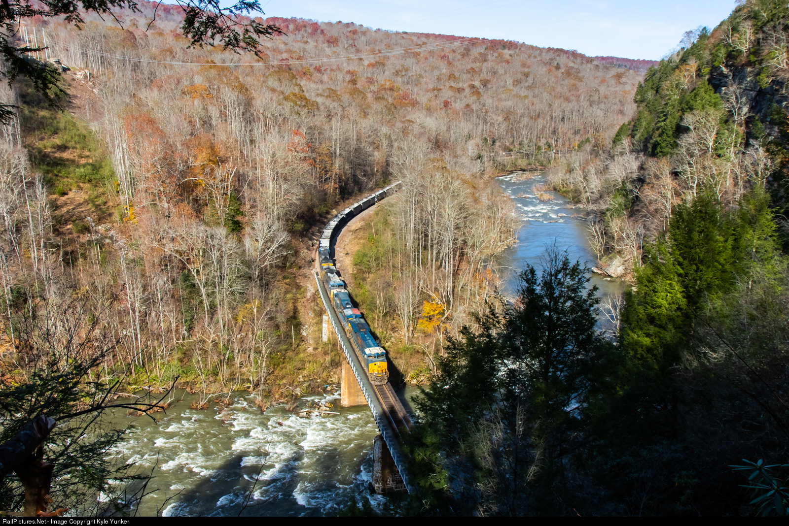 Four CSX GE's bring train C871 past the south end of Towers and across the Russell Fork with 200 empties to be loaded at McClure,VA.