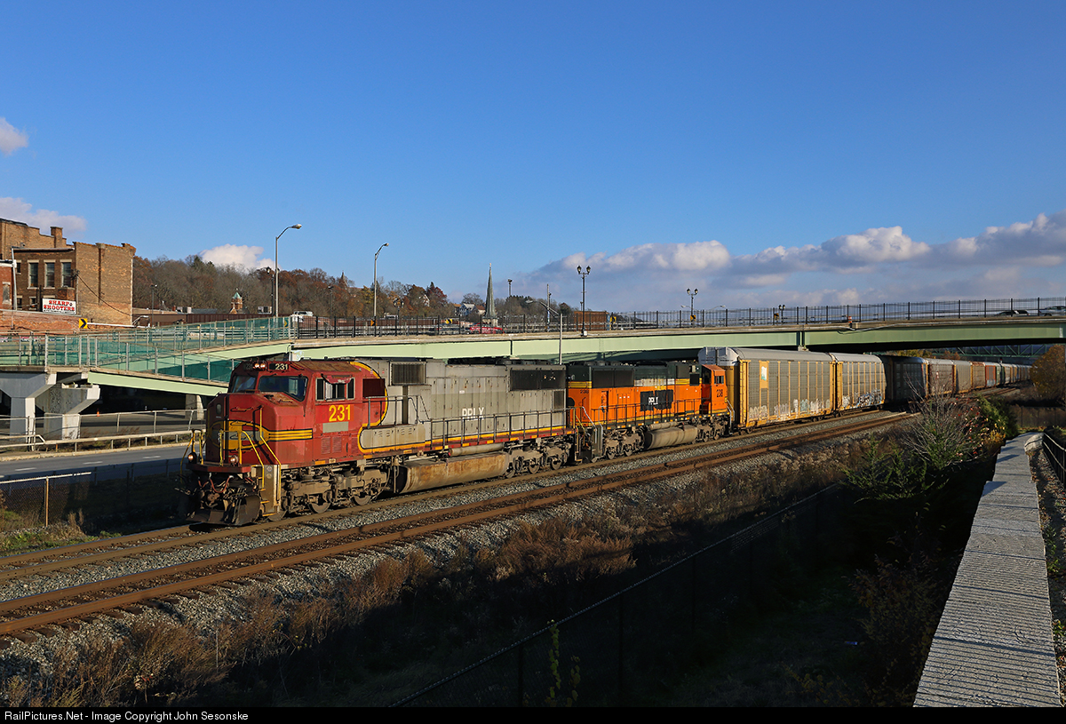 | A set of former Santa Fe SD75M's lead an empty autorack train WB on CSX's Mohawk Sub on a bitterly cold Saturday in early November. The lead unit is still in it's original warbonnet while the trail unit, PRLX 238, is in BNSF H2. The season's first light snow the night before was followed by temps in the 30's and high winds gusting in the 40's in the Mohawk Valley. |
