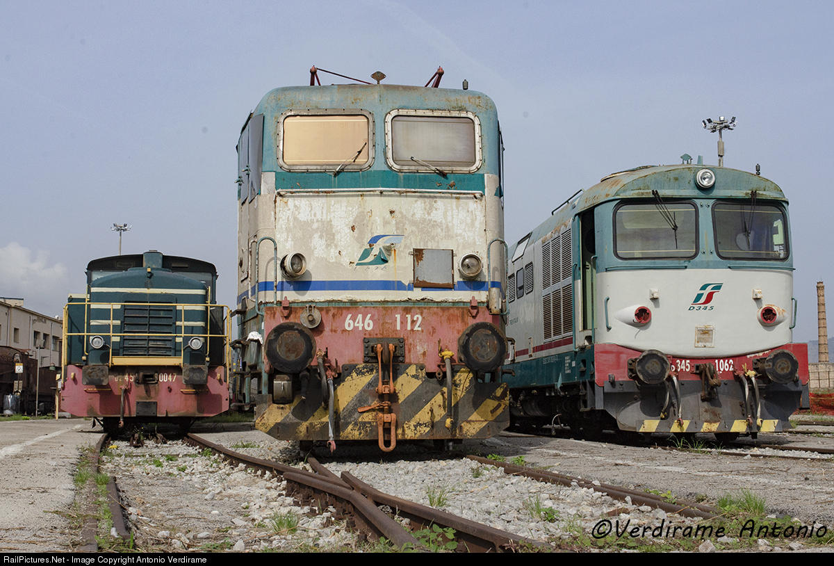 Junk yard area at the Locomotive terminal in Palermo where all locomotives and wagons to demolished are colleted. Left, shunting locomotive 245-0047 Mid, E646-112 (all openings are panelled with steel plates) Right, diesel Locomotive D345-1062 These units are about 40-50 years old; no more spare sparts. Parts still functional are removed and used on the very few units still in service