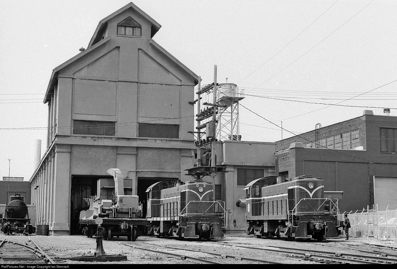 | The railway operations in the Port of Montreal were previously known as the National Harbours Board (NHB) Railway. Two S-3 switchers sit outside the NHB locomotive shop that was built in 1912. Over the last 106 years the NHB shop forces have maintained steam. electric and diesel locomotives in this building. |