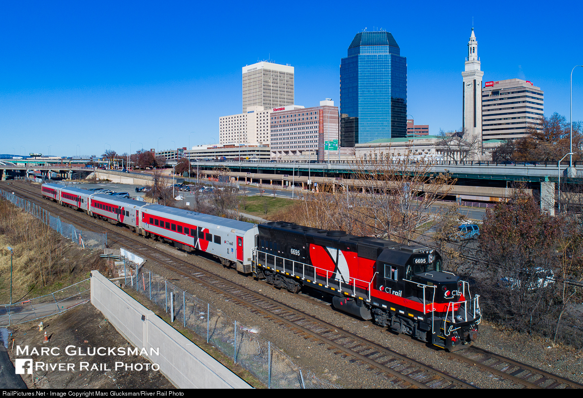 Service expansion. Hartford Line CT Rail Train 4405 is a recent addition to the schedule, as seen on Friday, November 23, 2018 with 6695 (GP40-2H) leading. This increase in service is to accommodate the rising ridership on the Hartford Line. The skyline of Springfield, MA populates the background with Monarch Place, at 401 feet, notable as the tallest building in the city.