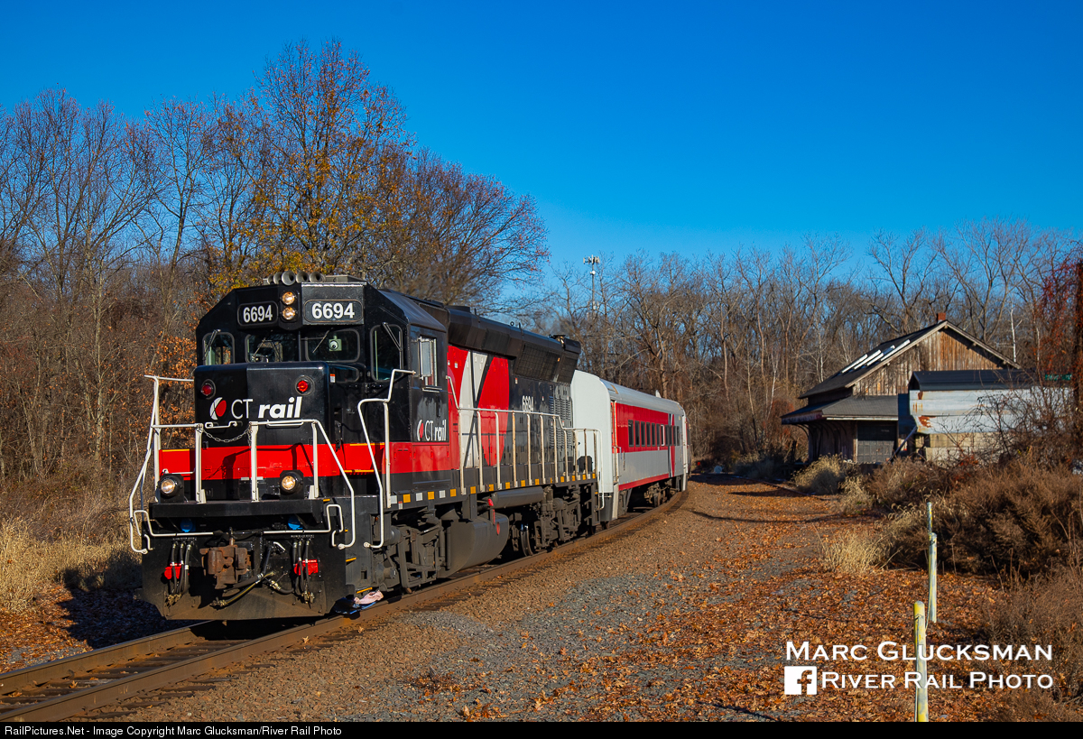 Not stopping here anymore. The former NH Warehouse Point Depot in Enfield, CT has been out of use for many years as we see it in the background on Friday, November 23, 2018. Hartford Line CT Rail Train 4407, with 6694 (GP40-2H) leading, displays the new "Coke Zero" paint scheme of CT Rail.