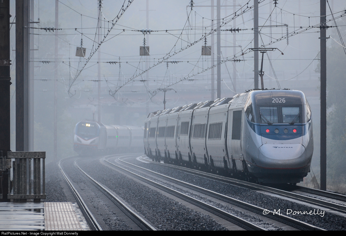 A foggy but action packed morning sees an Acela depart as a Northeast Regional arrives.