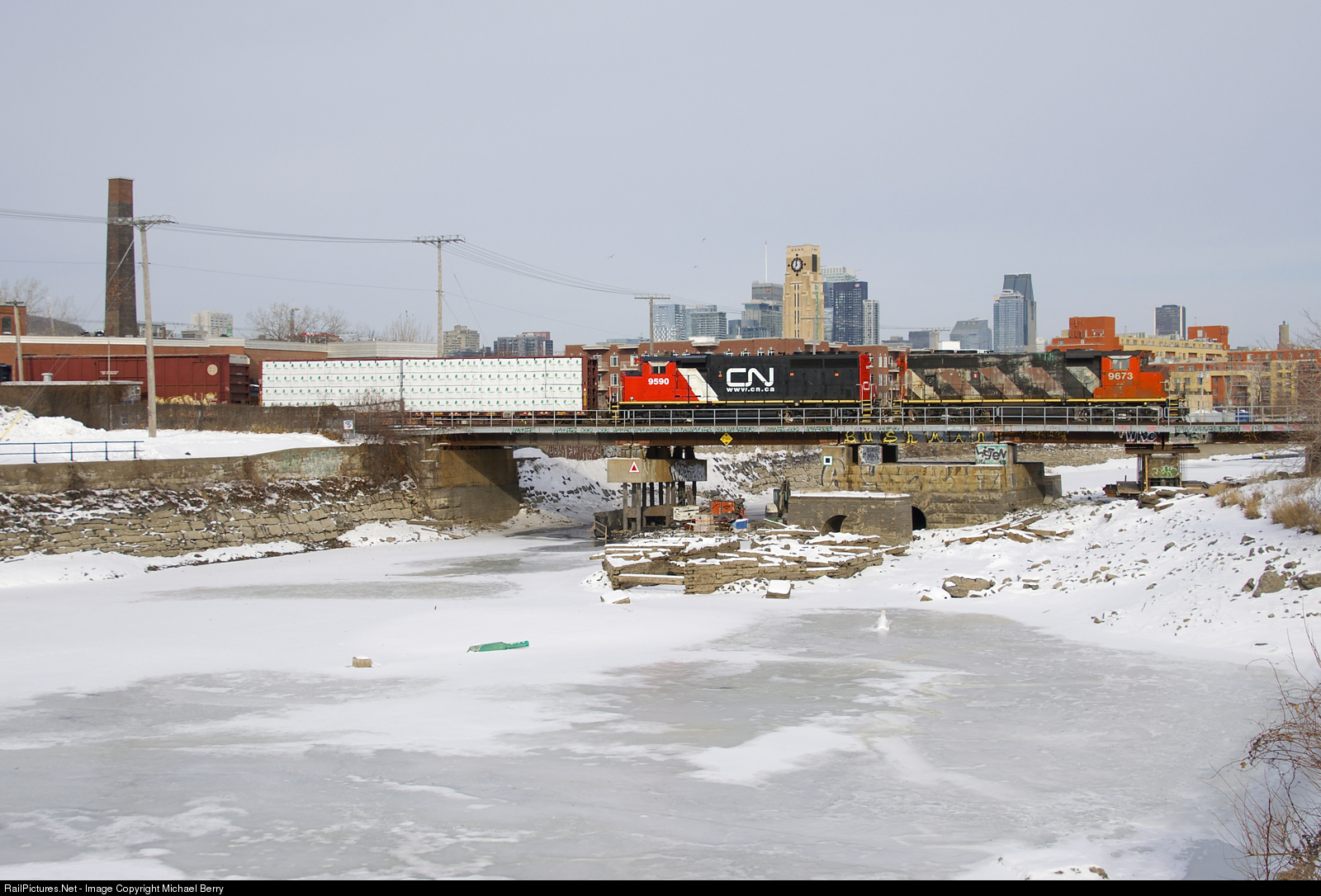 | Differing GP40 models and paint schemes. CN 324 has GP40's in very different paint schemes for power as it crosses the Lachine Canal with 51 cars to interchange with the NECR at St. Albans, VT. Leading is ex-GO Transit GP40-2(W) CN 9673 in a faded zebra paint scheme, while trailing unit GP40-2L(W) CN 9590 is quite clean and sports CN's current website paint scheme. |