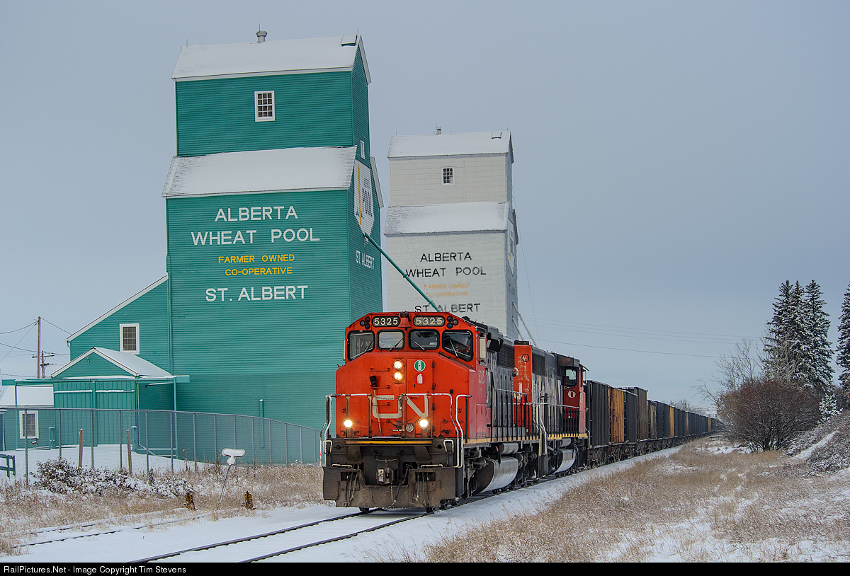 CN SD40-2Ws 5325 and 5279 had their work cut out for them last night, hauling 74 loaded gravel cars from Whitecourt into Edmonton. Here, they're seen passing the grain elevators at Mile 5 of the Sangudo Sub, St. Albert.