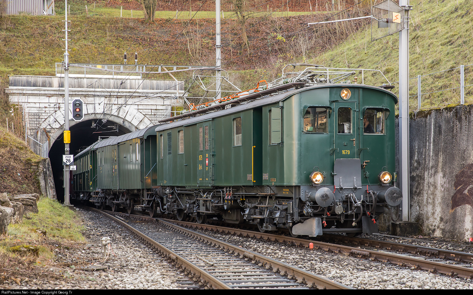 Baggage railcar De 4/4 # 1679 of SBB Historic is leaving the 2495 metre long Hauenstein tunnel at Läufelfingen with a contemporary passenger train. This first long railway tunnel in Switzerland was built from 1853 to 1858. This 800 kW railcar from 1928 is now operated and maintained by the "Be 4/6 Gruppe" of Winterthur.