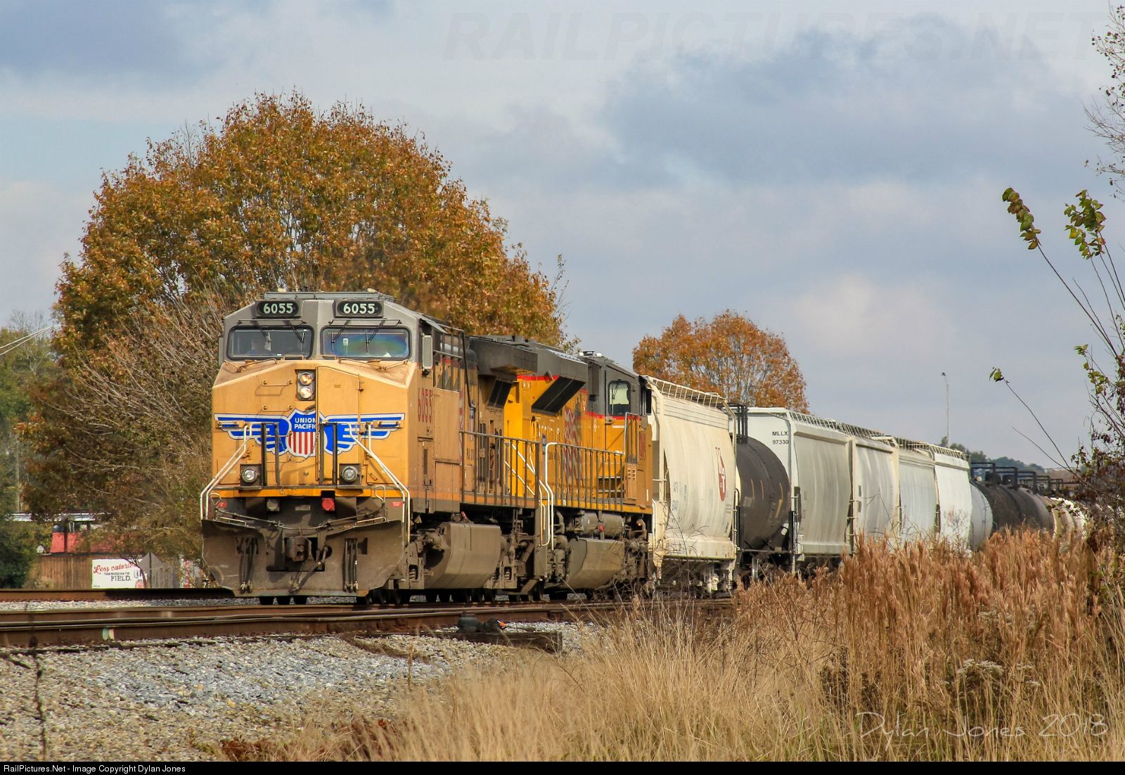 | NS train 393 stops on the "2 scales" track by the sewage plant to await the arrival of Amtrak 20 before highballing down the NO&NE towards New Orleans. I have to admit, UP Armour Yellow looks sharp with the falls colors around it! |