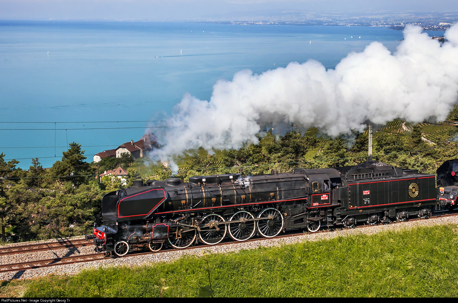 | 4-8-2 former french railways SNCF 241 A 65 of associaton "241A65" was built in 1931 by Cie de Fives in Lille as 241-001 for the ETAT, the driving wheel diameter is 1,95 metre and the maximum velocity 110 km/h. The locomotive is storming up the line from Lausanne to Puidoux-Chexbres near Grandvaux, with the Lac Léman (Lake Geneva) in the background. |