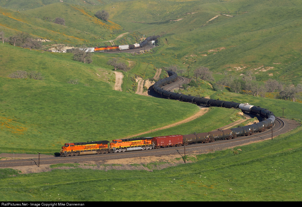 On March 2, 2016, a westbound BNSF unit tank train of ethanol makes its way over California’s Tehachapi Pass as it wiggles through the curves at the west end of Bealville sidings. A pair of six-motor GEs are on the rear of the train in the foreground and have just exited the horseshoe curve at Allard. In the background is a pair of GE C44-9Ws operating as a mid-train DPU. Already through Tunnel 2 and out of sight on the right are the four locomotives on the point of the heavy train.