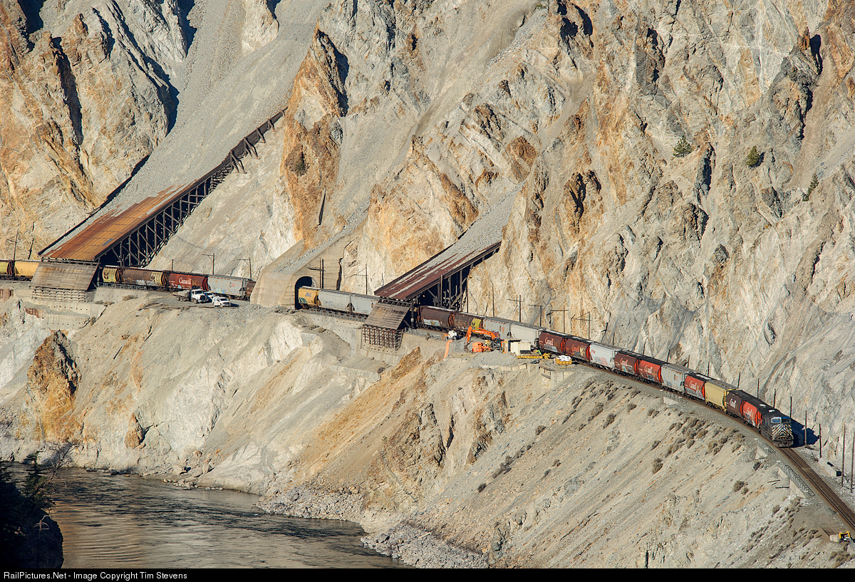 Maintenance crews battle the continuous wear and tear on the snowsheds and tunnels east of Lytton, BC on CN's Ashcroft Sub as CP 301-440's train heads west hugging the mountain walls.