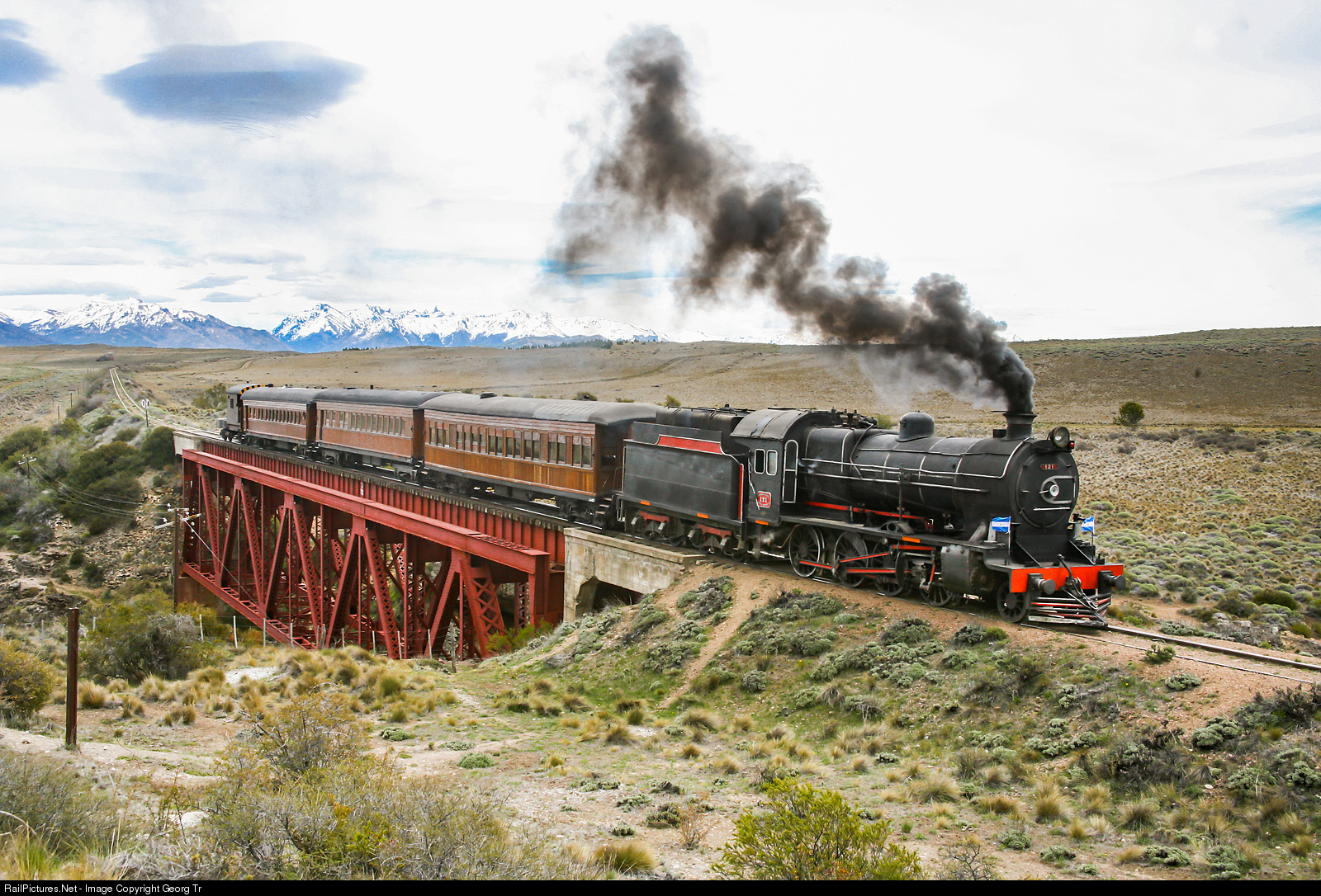 Broad gauge (1676 mm/5 ft 6 in) oil fired 2-8-0 North British built former BAP (Buenos Aires al Pacífico) # 121 from 1912 with the touristic steamtrain from San Carlos de Bariloche to Perito Moreno.