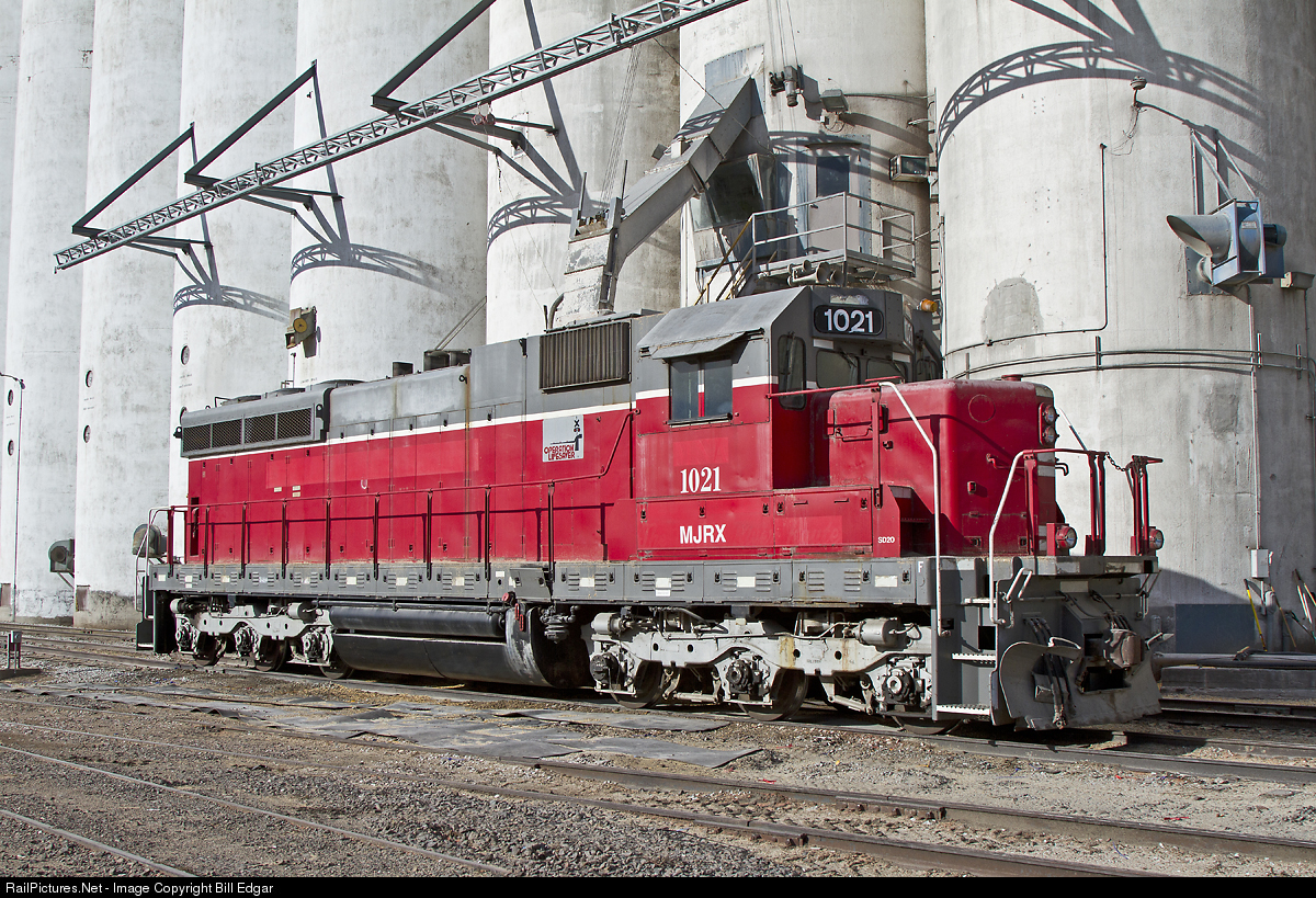 | MJRX 1021 makes a fine grain elevator switcher at the large elevator along the UP main at Gothenburg, NE. Built in January 1960 as Southern Ry. SD24 no. 6315, it was acquired by Illinois Central and rebuilt into SD20 no. 2021. It was sold to the Missouri & Northern Arkansas before being acquired by its present owner. |