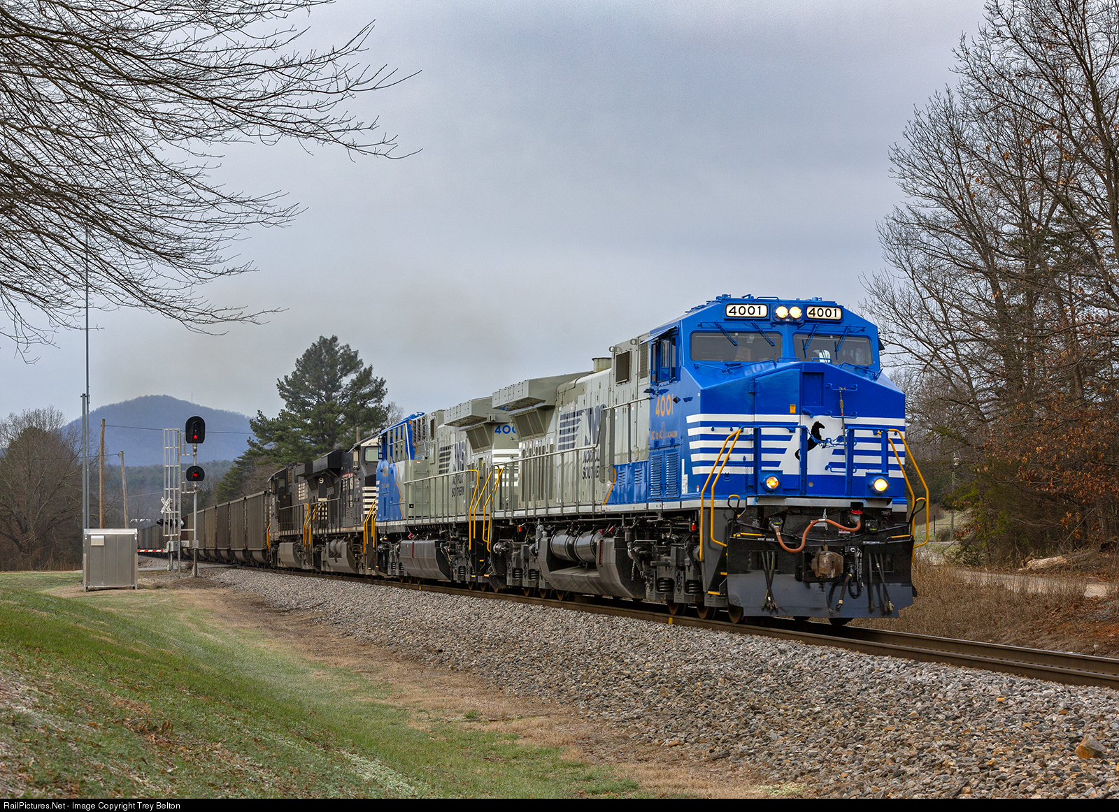 | The NS 4001 and NS 4000 "DC to AC" units lead the NS 757 north to Roanoke on the return trip from the first revenue run of these units to Belews Creek Steam Station. The Winston-Salem District was used extensively by NS to test these Conversion units, making many trips between Roanoke and Belews Creek Steam Station on coal drags. |