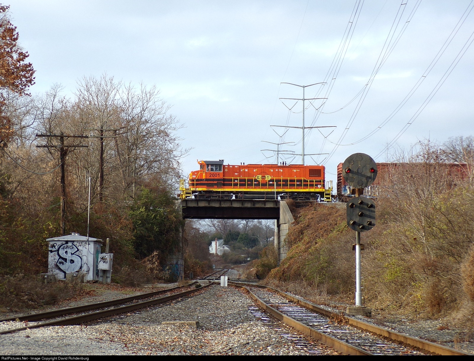 I&O's Blue Ash Local returns to McCollugh Yard after working industries in its namesake community, seen here crossing the bridge that carries the McCollugh Yard Lead from the Blue Ash Subdivision over the I&O's Oasis Subdivision at CP RIDGE in Norwood.