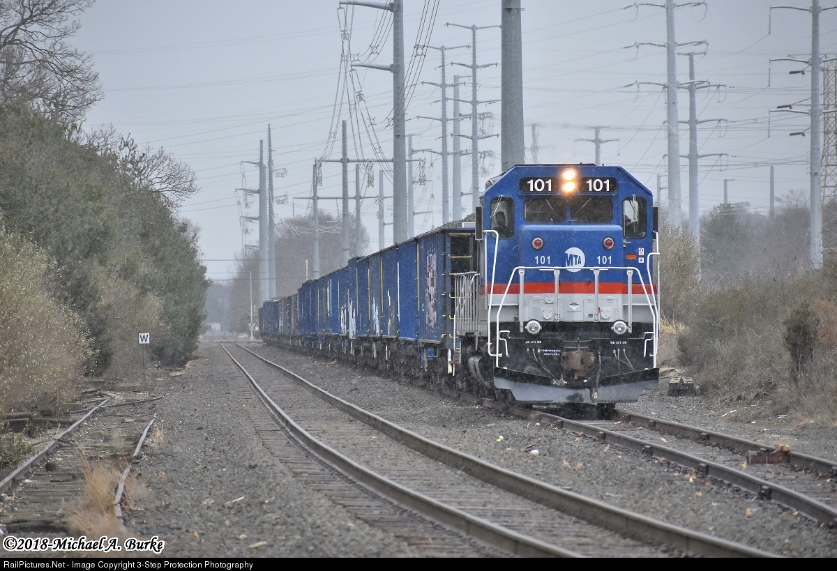 | A light wintry mix begins to fall, as GP35R 101 works the Waterbury Branch ballast track in Milford. Metro-North keeps hoppers filled with stone here for when they are needed elsewhere on the railroad. |