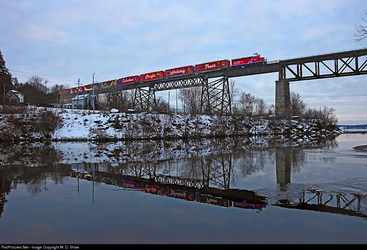 | The CP Holiday Train steps out over the Seguin River in Parry Sound after a slight delay caused by a CN stack train running just ahead of it having an unplanned stop right on the bridge. Parry Sound is in the southern part of a Directional Running Zone having all northbound traffic running on the CP tracks and southbound on CN. |