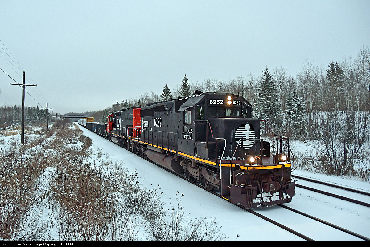 | IC 6252 and DMIR 402 lead a misc. road freight up from Two Harbors heading to CN Keenan yard with concentrate loads from Northshore Mining and wood siding from the Louisiana Pacific plant. These two units seem to have been pushed out of the iron ore hauling pool due to the arrival of multiple GE Dash 8's that have taken their place. |