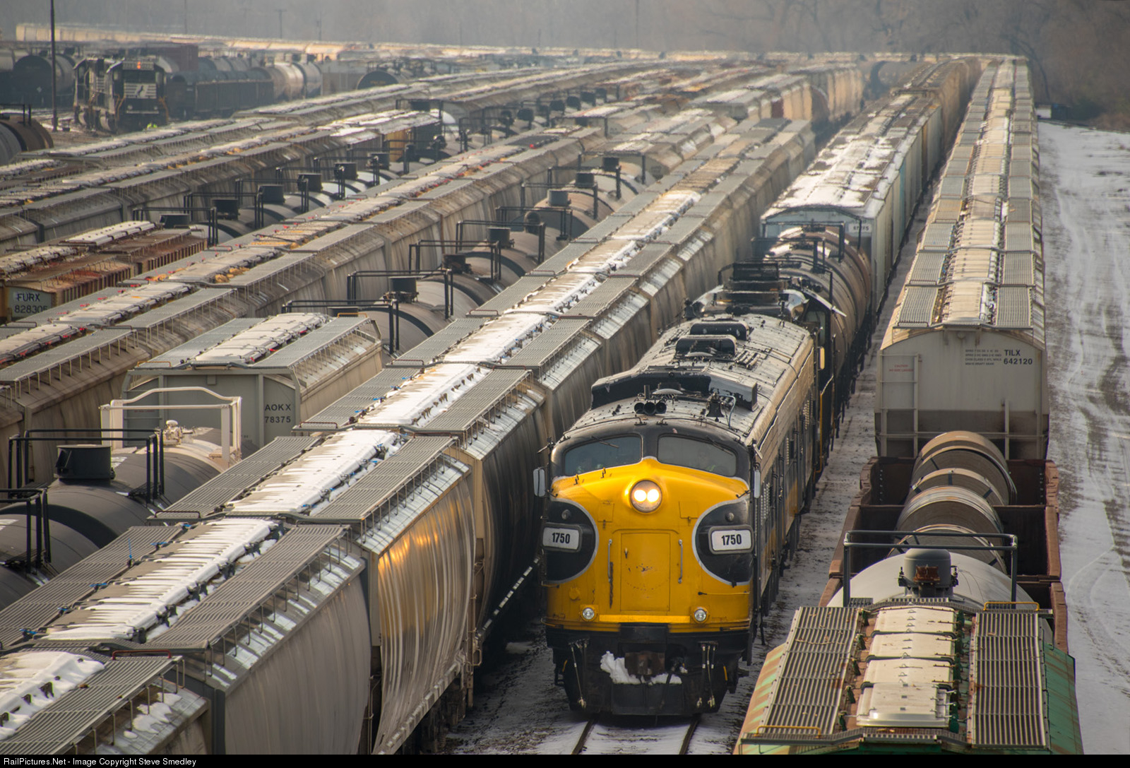 Keokuk Junction Railway's TZPR turn works at yarding a long train in a crowded Tazewell & Peoria Railroad in East Peoria, Illinois on Friday, November 30, 2018. The Norfolk Southern power in the upper left will be taking much of the KJRY train East.