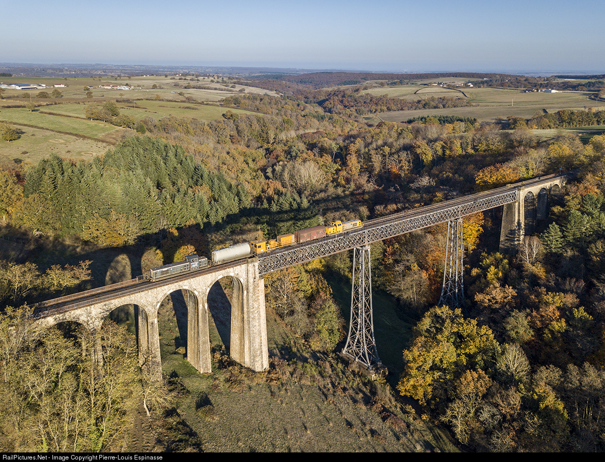 | Crossing the "Bellon" viaduct, this train runs the line between Gannat and Montluçon using a high pressure rail washing system which consists to combat slippery rail conditions from leaves falling on the tracks during the autumn months. |