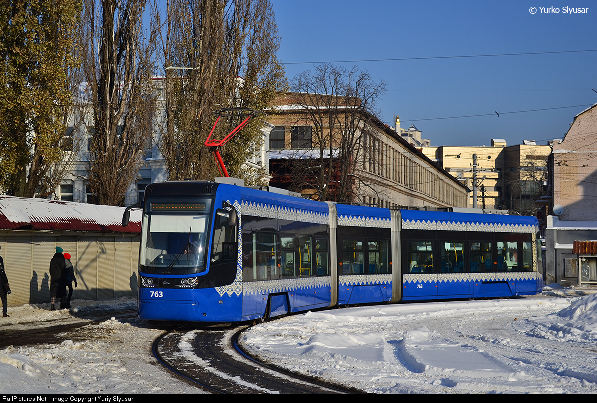 The tramway PESA 71-414K "Foxtrot" #763 enroute #1 Mykhailivs'ka Borshahivka - Starovokzal'na street just arrived to end station of this tram line. This tram built by PESA Bydgoszcz in 2017.