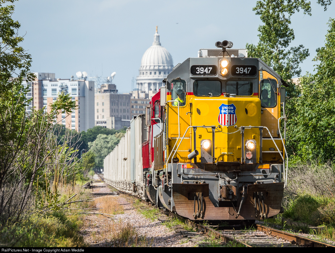 | L469 heads for Oregon with sand and gravel loads for Oregon, with the Wisconsin state capitol in the background. When WAMX 3947 first showed up on the Wisconsin & Southern, the UP herald was covered with tape. Eventually the tape wore off, and the company image of her former owner reappeared. This engine has since been repainted into the WSOR scheme. |