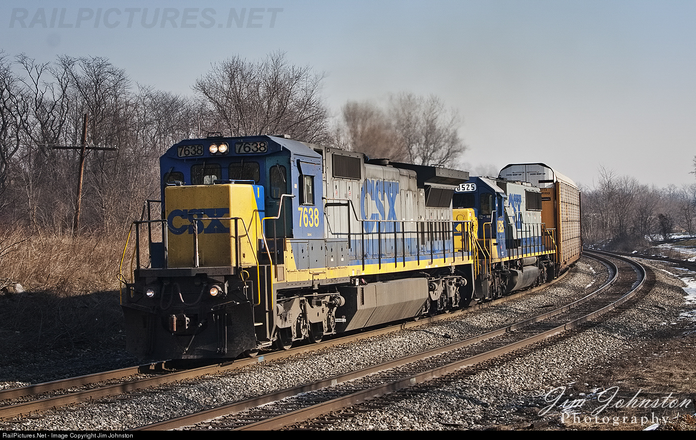 CSXT 7638 and CSXT 8525 lead an empty autorack train West past the Junction.