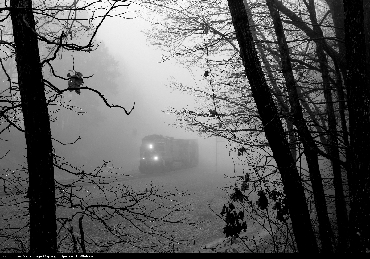 A spooky atmosphere settles over Cedar Gap as an intermodal cuts through heavy, early morning fog on a cool fall day.