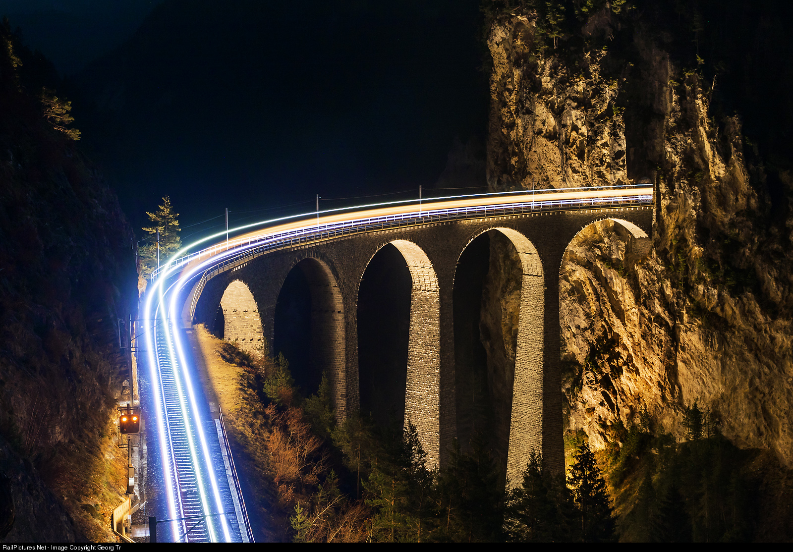 | Shortly after 6 PM, the Interregio 1160 from St.Moritz to Chur is crossing the 65 meter high Landwasser viaduct, part of the UNESCO World Heritage Site Albula Bernina since 2008. Pulling is Ge 4/4 III # 641 with blueish light of the new LED headlights after the refit. The iconic viaduct was built from 1901 to 1902 from local limestones and the Albula line was inaugurated in 1903 from Thusis to Celerina.