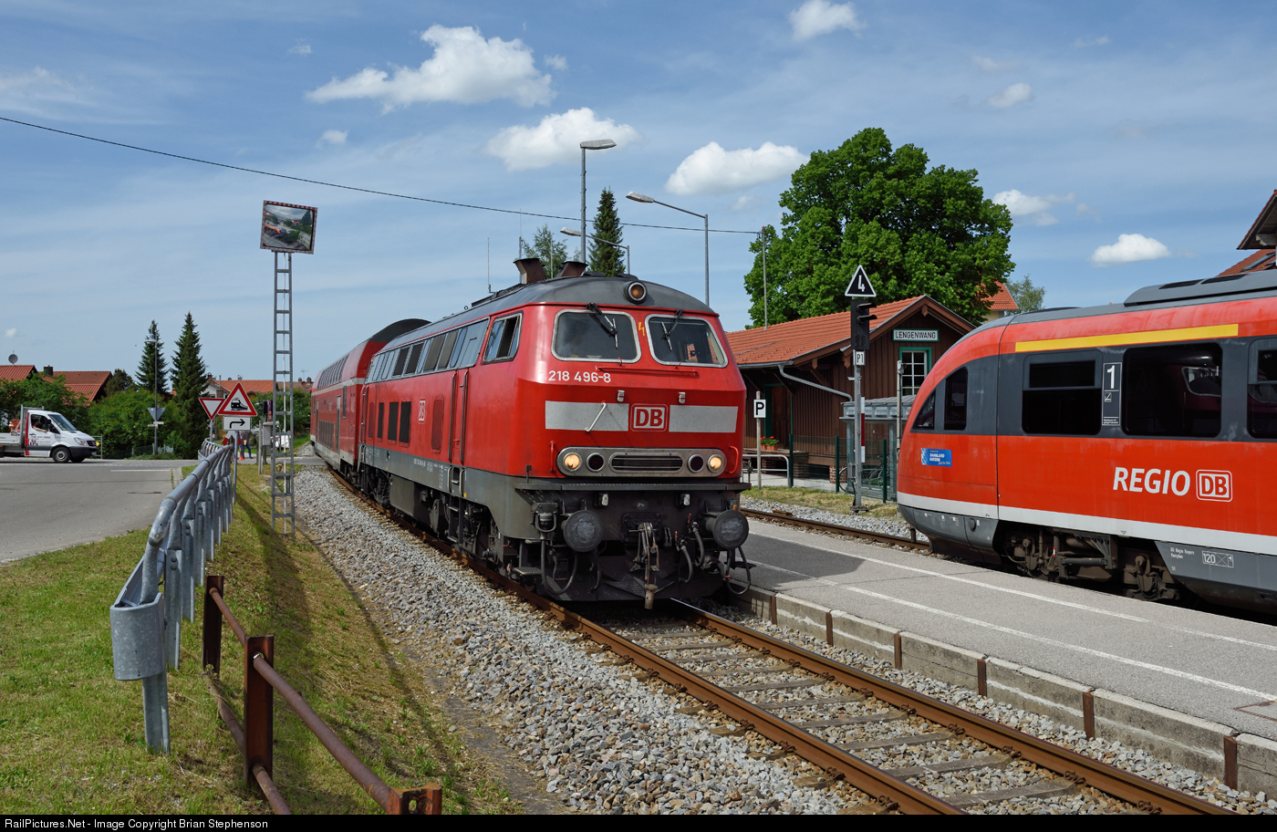 | A scene that will very soon be history - DB 218 496-8 arrives at Langenwang with an RE train from Munich to Füssen as a BR 642 DMU waits for the single line to clear on a service to Augsburg. DB Regio trains will replaced by a private operator next weekend and not only that the 218 has an expiry date of December 28, 2018 so sadly will most likely be withdrawn from service. |