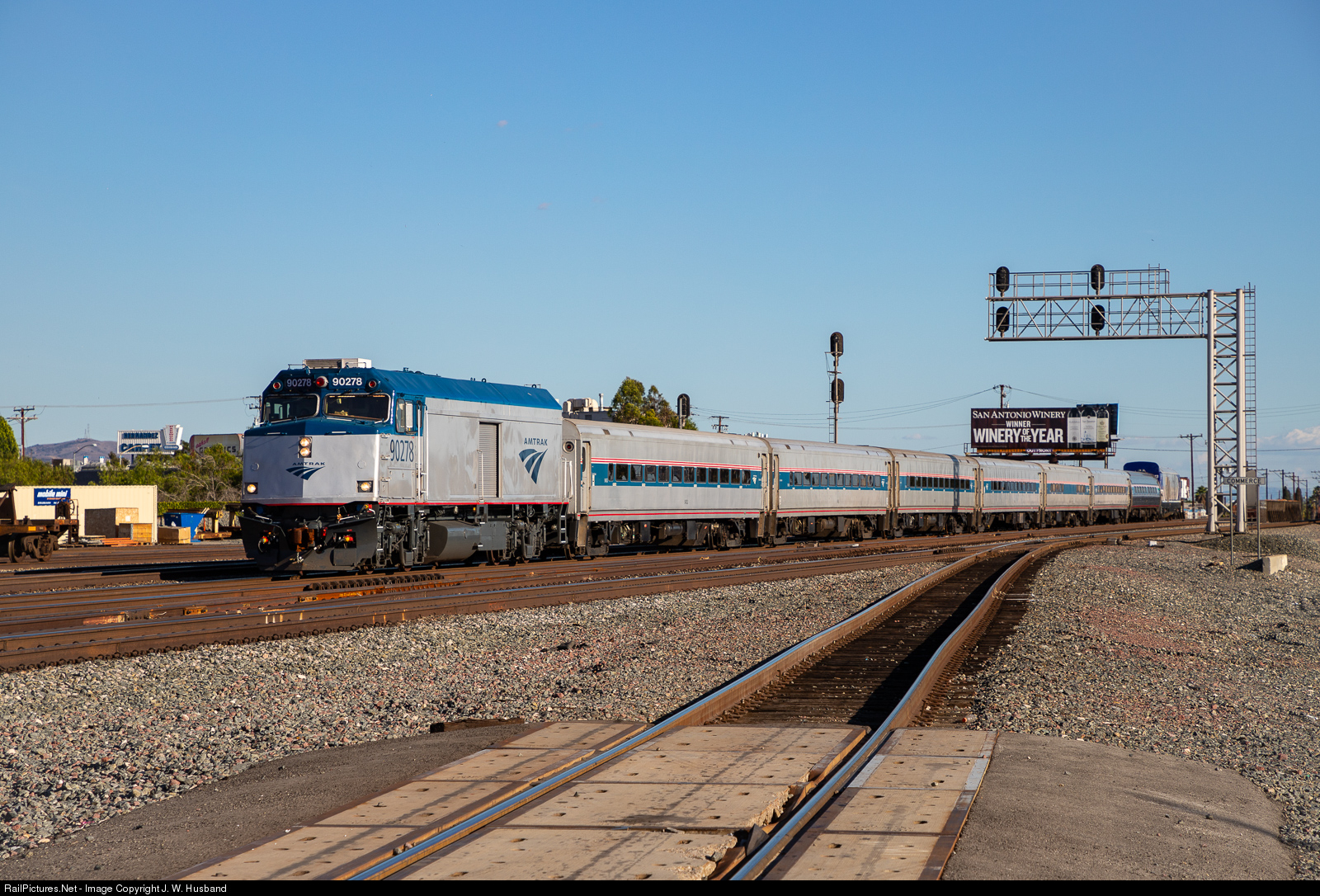 | Nearing Los Angeles, northbound Pacific Surfliner train #1573 sails through Commerce on BNSF's San Bernardino Subdivision with an ex-F40 NPCU "cabbage car" leading the way. |