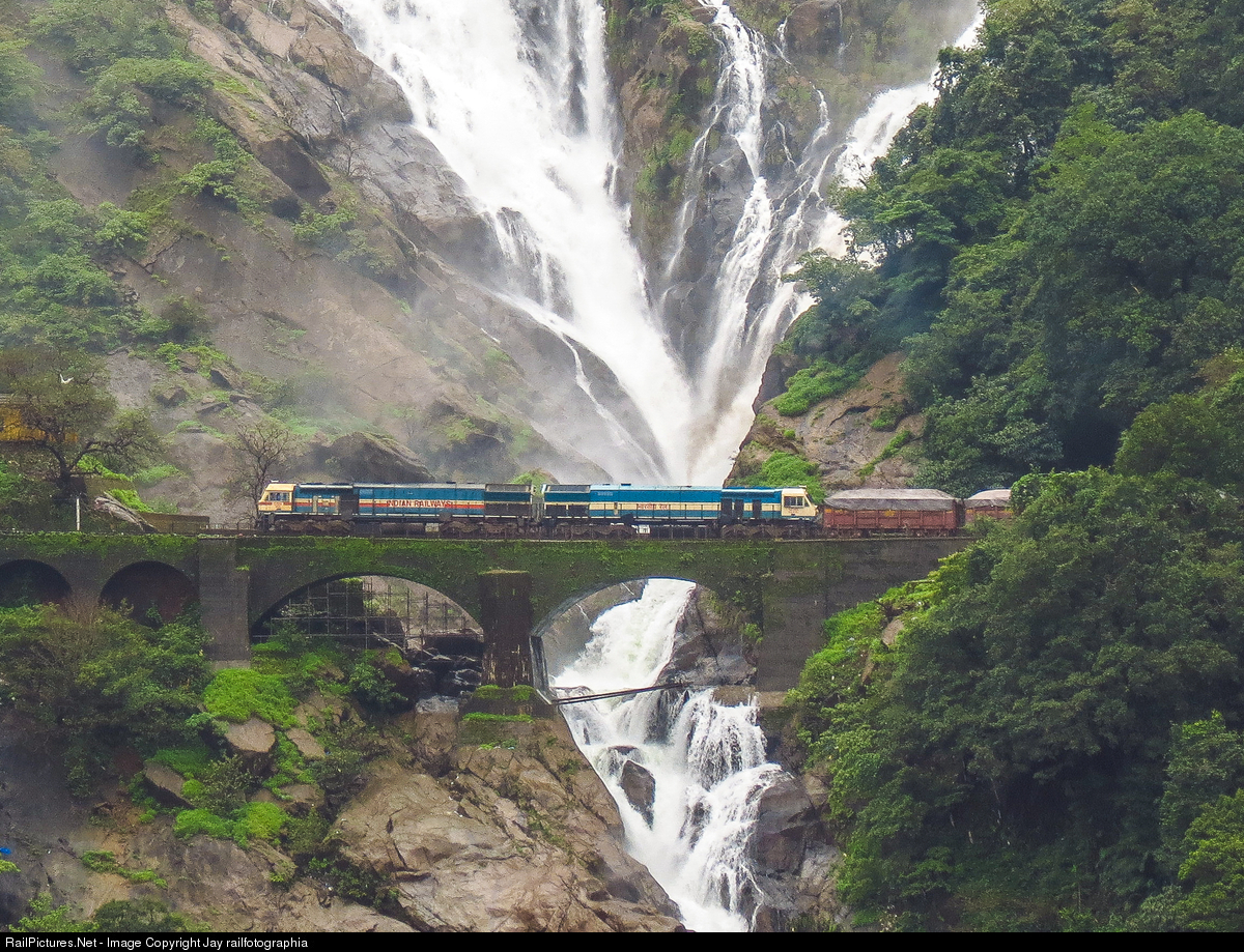 At the peak of monsoon, HUBBALLI WDG-4 pair climbing Braganza Ghats passing Dudhsagar Waterfalls with loaded coal train towards Castle Rock