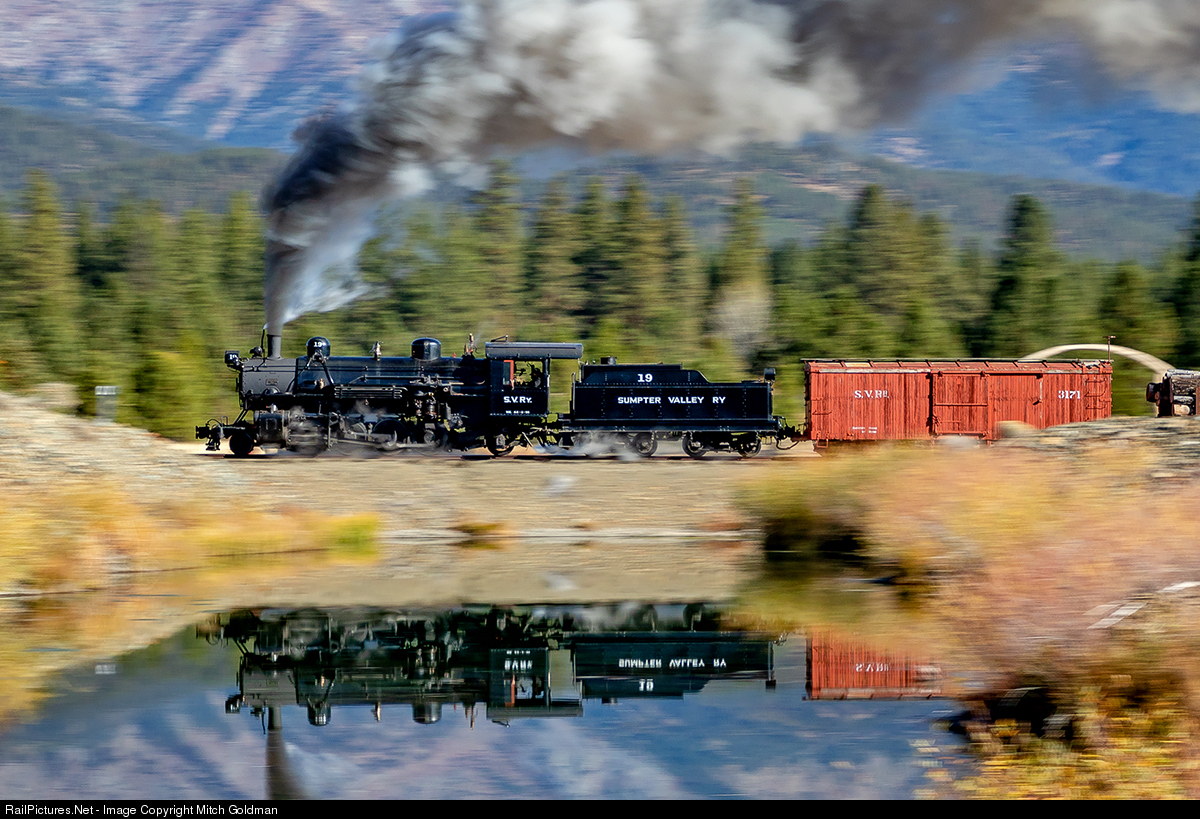 A modern day Sumpter Valley No. 19 keeps pace with a reflection of itself from the past against the unchanged backdrop of the Elkhorn Range during the Fall foliage peak. A (couple) of pan shots captured at 1/8th in my first ever reflection pan!