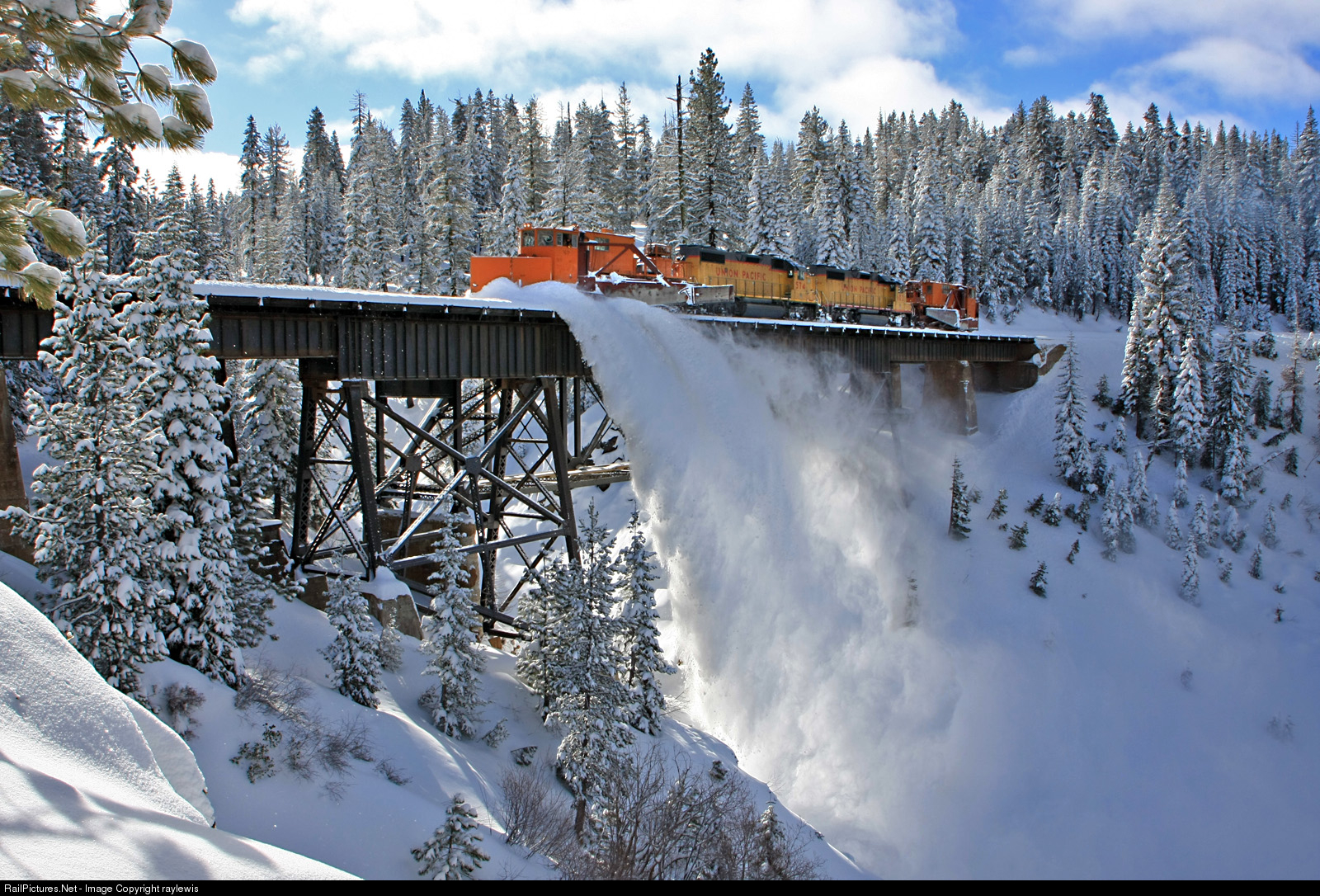 UP 574 and 589 provide the power for today's spreader operations. After plowing west to Shed 10, the spreader is now working east pushing snow off of the ROW over the Lower Cascade Bridge at Troy, CA.