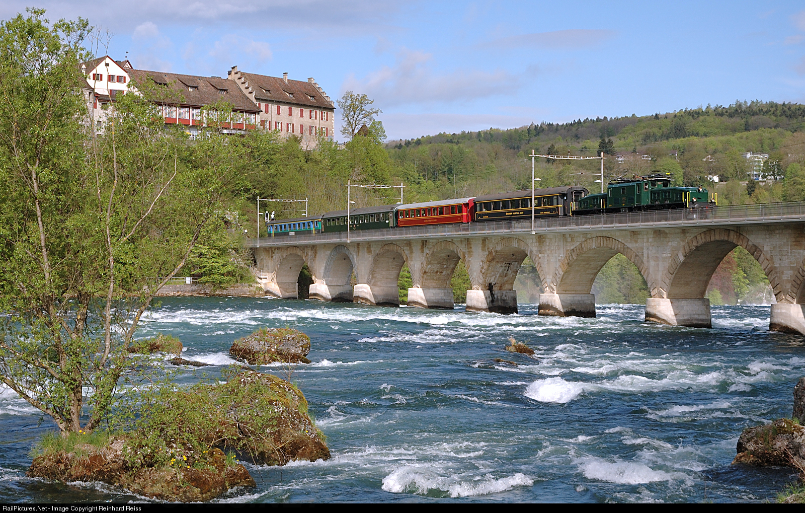 | Be 6/8 III from SBB Historic (operated and maintained by Betriebsgruppe 13302) passes bridge over Rhine Falls with a charter train from Zurich to Romanshorn. |