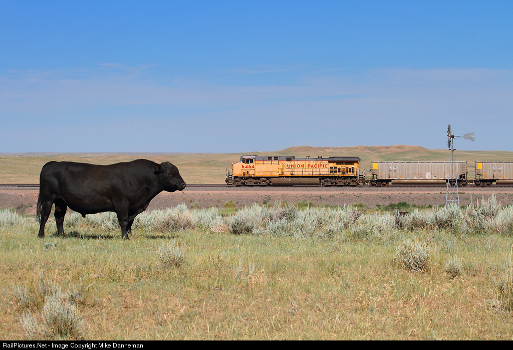In Powder River Basin, a lone DPU of a Union Pacific coal train passes an Aremotor-equipped well and some beasts that benefit from it just south of Bill, Wyoming, on July 3, 2016. I’m not sure which is more captivating to this bull—watching a moving train with his left eye—or seeing the photographer with his right.