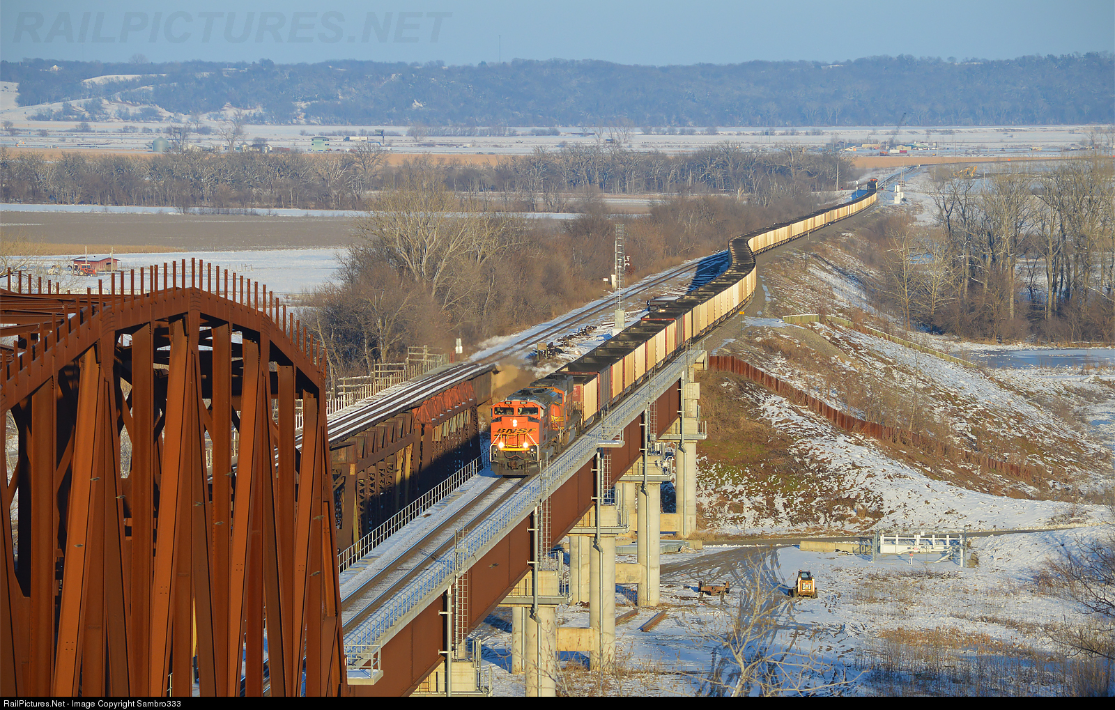 | An empty coal train coming from Council Bluffs snakes its way up onto the Missouri River Bridge. The old span to the left now serves as River Siding. Trains bound for Council Bluffs or the Bayard Subdivision will wait in the siding for their warrant onto the Council Bluffs Subdivision. |