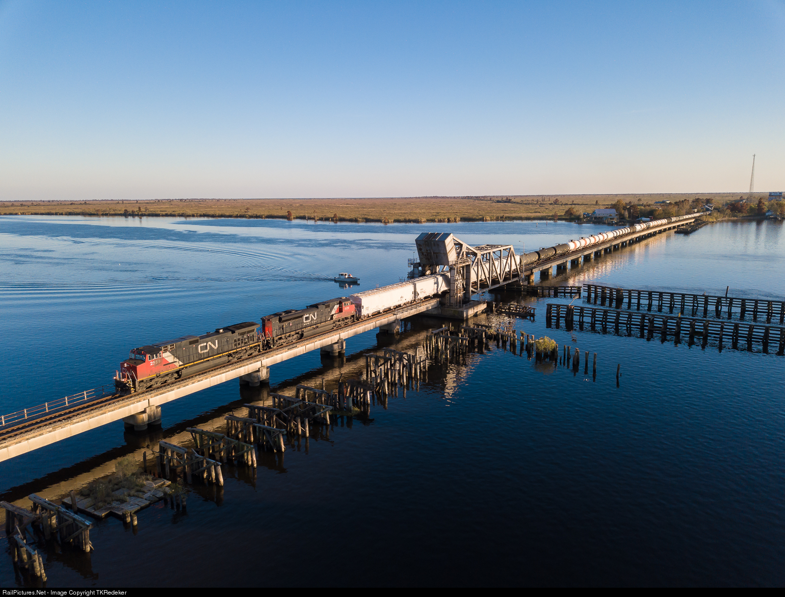 Canadian National manifest train A419 rolls northbound over the Pass Manchac drawbridge in late afternoon light.