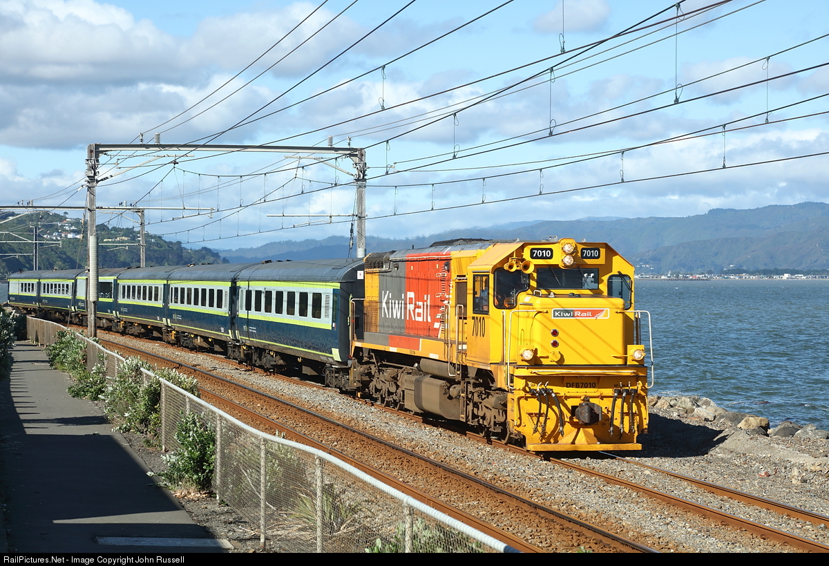 | The DFB class was originally built by EMD in Canada in 1979 and rebuilt in 1990s as DFT with recent upgrade with Brightstar etc. This Metlink train connects Masterton and other towns with the capital and there are several each way on weekdays, some 8 cars long. |