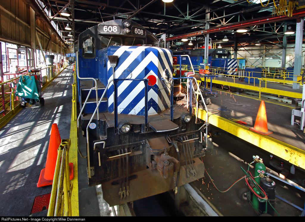 In Livingston, Montana, on May 7, 2012, Montana Rail Link EMD SD9 No. 608 is in MRL’s Livingston Shops getting sheet metal work done by a machinist. Two tracks over in the background in the process of repair is SD45 No. 328.
