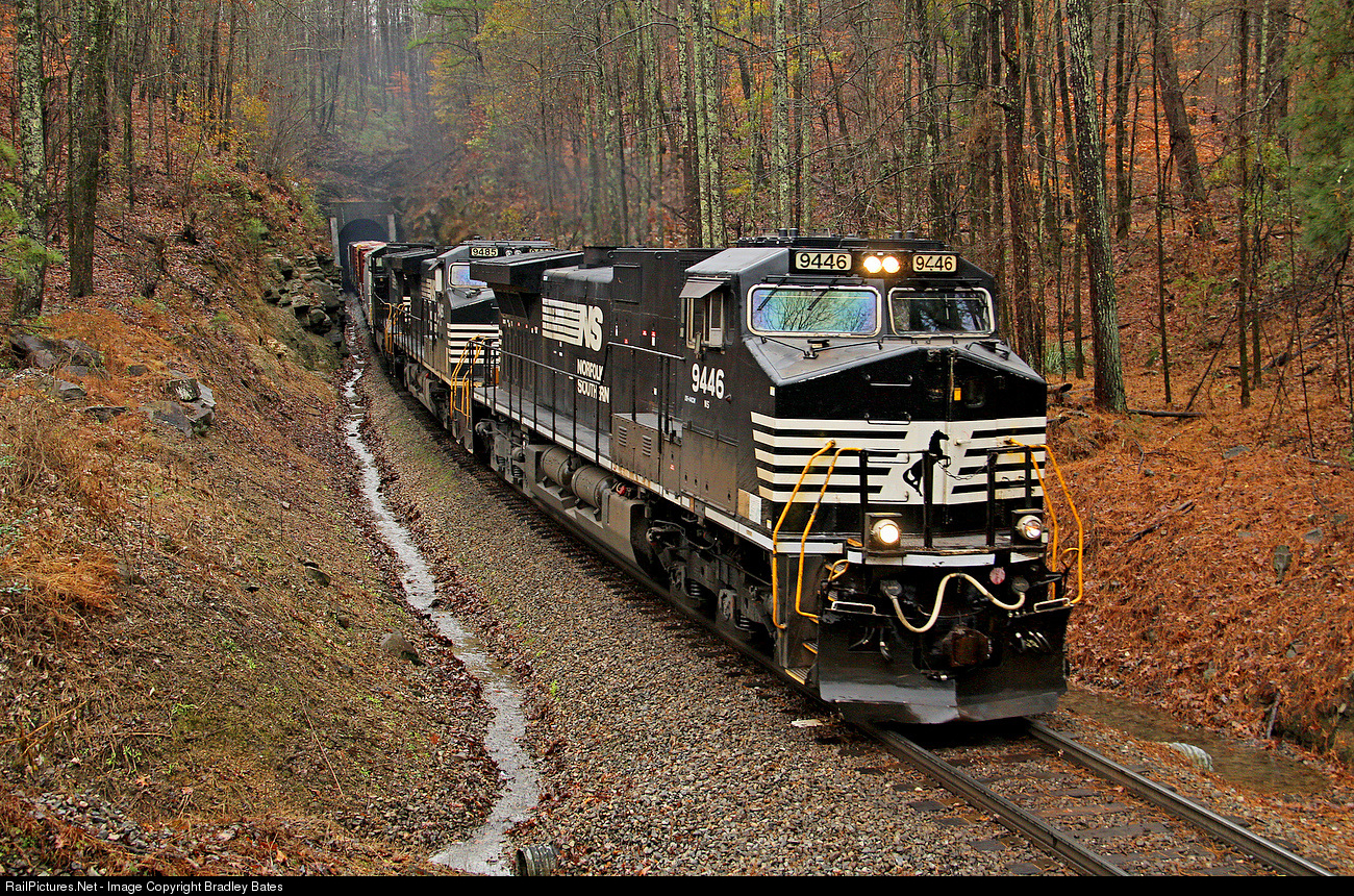 | Norfolk Southern Train 153, heads west out of the tunnel at Cook Springs, AL. With a trio of NS C40-9W's for power. |