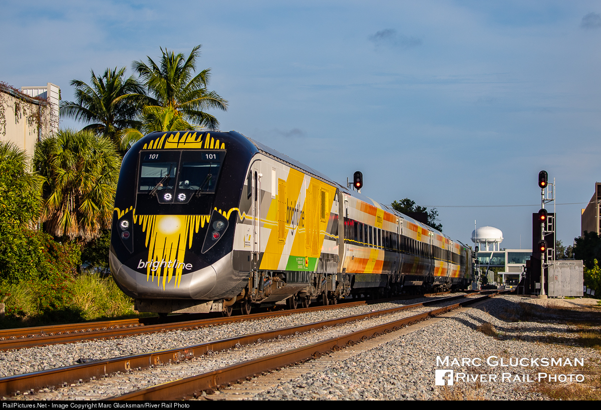 Bright day on the Brightline. The GoBrightline Orange set flies past the control point at Fort Lauderdale Bridge on the morning of Sunday, December 9, 2018. Bracketed by Siemens SCB-40s 101 and 105, the four coaches in between have a capacity of 240 passengers. This service is approaching its one year anniversary and while it currently runs between West Palm Beach and Miami, FL, expansion is planned to Orlando.