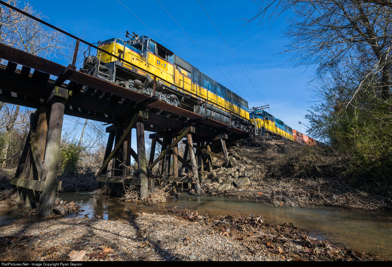 | The De Queen & Eastern has just picked up a cut of cars from the neighbouring KCS as they trundle over the Little Bear Creek in De Queen, Arkansas. Lead locomotive no. D-7 was purchased new from EMD in 1966 and has spent its entire working life on this sweet little railroad in the South. |