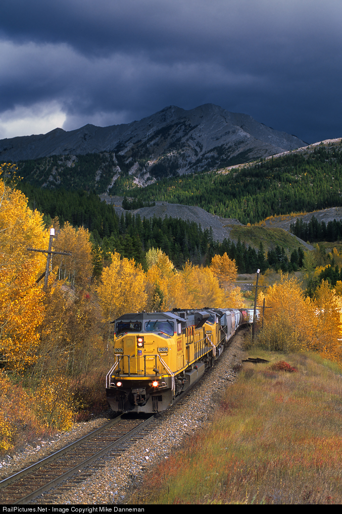 A westbound Canadian Pacific grain train led by two Union Pacific EMD SD9043MACs approaches historic Crowsnest Pass, Alberta, on September 28, 2010, and will soon be crossing into British Columbia. With the locomotive pool agreement with CP and UP between Calgary and Spokane, pure sets of UP power, especially SD9043MACs, on this line during this era was commonplace.