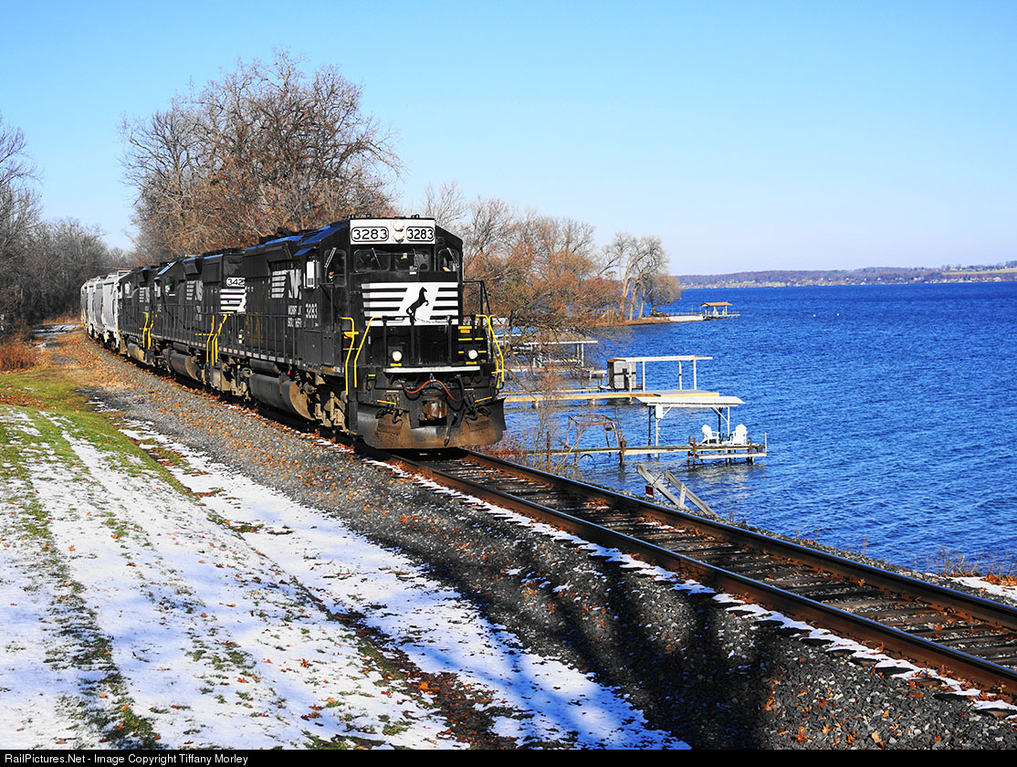 Norfolk Southern's HO6 travels South along the Seneca Finger Lake on Sunday afternoon with a train from Finger Lakes Railway's Geneva Yard. Locomotives: NS 3283, NS 3422 and NS 5095