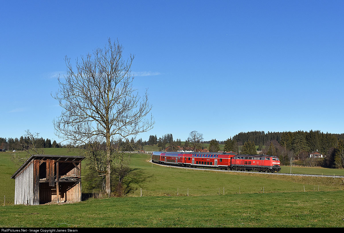 | 218 429 propels the 10:06 Fussen - Munich through farmland at Weizern-Hopferau. In just a few weeks time on Sunday 9th December loco haulage would finish on the Fussen branch as the operation was taken over by Bayerische Regiobahn who would introduce new DMU's. |